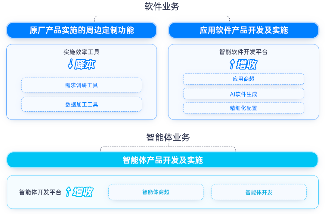 通过AI原生开发、无代码配置,助力企业低成本拓展软件新产品品类,降低试错成本,快速增收